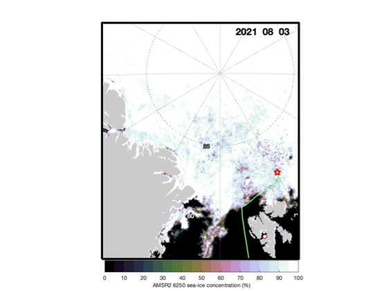 We are coming closer to the Northpole - now at 84 N! The map below (made by John) shows our position on the 3rd of August. From there we have travelled straight up further north, almost to the 85 latitude band. We were in a big lead (elongated open ocean among the sea ice) for a long time, almost no ice visible, and the thick fog made the visibility rather low (only 300 m). I assume the helicopter flight that was planned for today got cancelled due to the fog - maybe they will go tomorrow instead of us? The plans keep on changing all the time, due to the weather dependence (or technical issues). Anyways, we are still preparing the instruments for the possible helicopter station tomorrow.